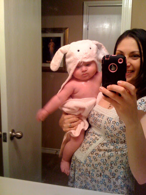 Rolling side to side is something she has been doing for quite a while, but she still gets her arm caught underneath her so I haven't seen her do a complete roll yet. Crawling is in the near future, I hope. Emily doesn't like to be on her belly for very long, but I think it's because she becomes frustrated that she can't get anywhere. Her back legs work really well and push up under her, but her arms aren't coordinating with her legs so she isn't getting movement. You can see that she's trying because her face scrunches up, her hands start to grab onto the floor and her legs are trying to push her body forward. After a couple of minutes of no progress, she cries out and you kow she's done.